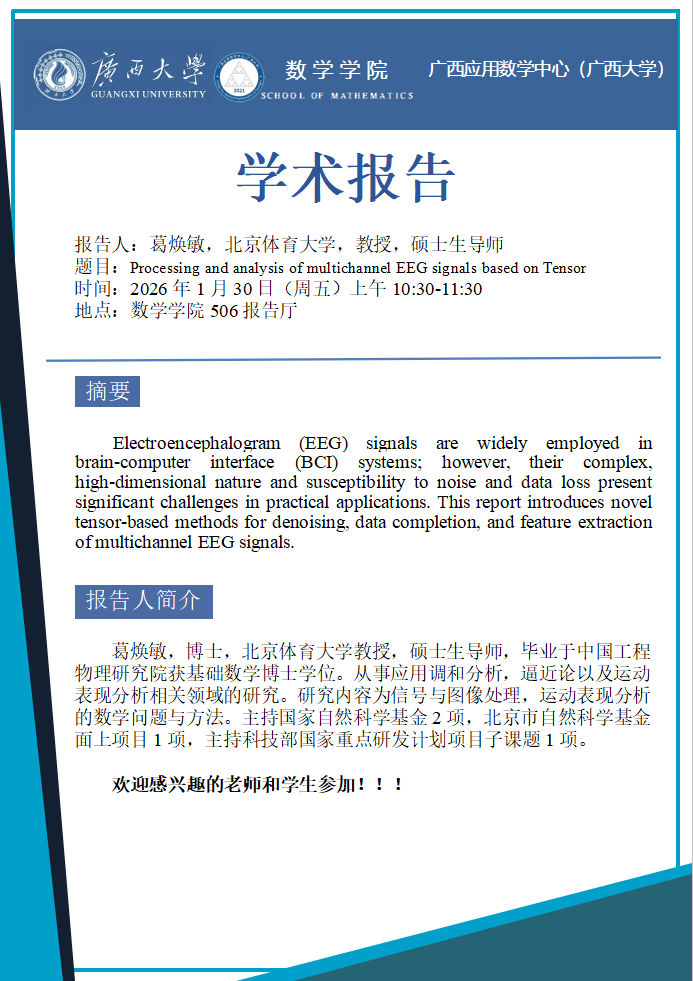 学术报告:Processing and analysis of multichannel EEG signals based on Tensor